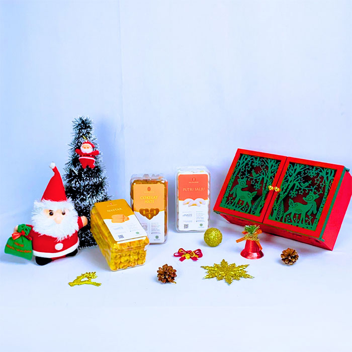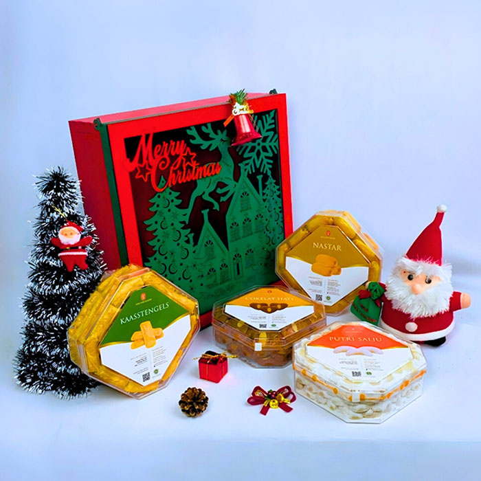 Hampers aneka cookies seperti nastar, kastangel serta putri salju yang dipadukan dengan beragam produk.